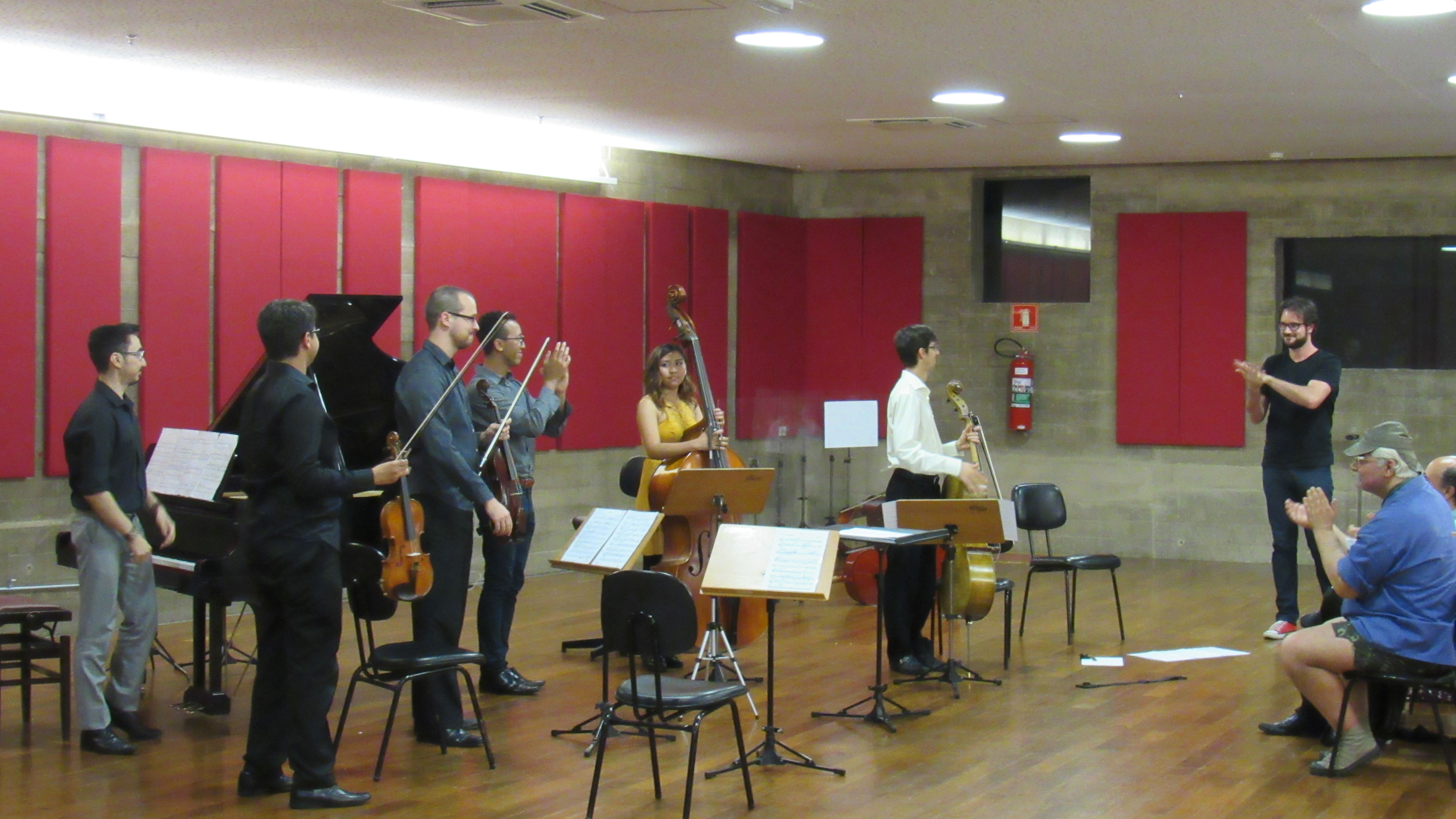 Em 2017 o prof. Daniel S. Mendes frequentou a oficina Ateliê Contemporâneo, da Escola Municipal de Música e Dança de São Paulo, o que deu a oportunidade de trabalhar composições com dois grupos. Aí na foto está o registro da estréia da peça LETE, para violino, viola, violoncelo, contrabaixo e piano, que foi um dos seus trabalhos de composição nessa oficina. O áudio e vídeo estão sendo mixados e já já vai pro YouTube.
